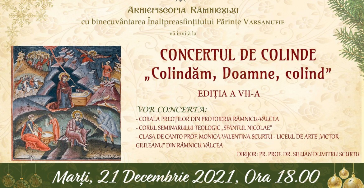 Cu binecuvântarea Înaltpreasfințitului Părinte Varsanufie, Arhiepiscopul Râmnicului, marți, 21 decembrie, la Biserica „Înălțarea Domnului” - Ostroveni va avea loc Concertul extraordinar de Colinde „Colindăm, Doamne, Colind ”, ediția a VII-a.