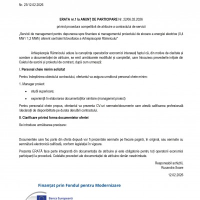 Erata nr. 1 la Anunț de participare Nr. 17/06.02.2026 privind procedura competitivă de atribuire a contractului de servicii Studiu de Fezabilitate pentru realizarea unei capacități de stocare a energiei electrice (0,4 MW / 1,2 MWh) aferente centralei fotovoltaice a Arhiepiscopiei Râmnicului in cadrul proiectului „Elaborare Studiu de Fezabilitate pentru realizarea unei capacități de stocare a energiei electrice (0,4 MW / 1,2 MWh) aferente centralei fotovoltaice a Arhiepiscopiei Râmnicului”, investiție pregătită pentru depunere în cadrul Fondului pentru Modernizare – Programul-cheie 1: Surse regenerabile de energie și stocarea energiei, Arhiepiscopia Râmnicului organizează procedură competitivă pentru atribuirea contractului de servicii.