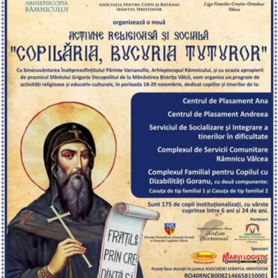 Cu binecuvântarea Înaltpreasfinţitului Părinte Varsanufie, Arhiepiscopul Râmnicului, în Anul omagial al educaţiei religioase a tineretului creştin ortodox şi Anul comemorativ al Sfântului Ierarh Martir Antim Ivireanul şi al tipografilor bisericeşti, Arhiepiscopia Râmnicului, Asociaţia pentru copii şi bătrâni „Sfântul Hristofor”, Liga Femeilor Creştin Ortodoxe Vâlcea, Seminarul Teologic „Sfântul Nicolae” Vâlcea, vor organiza un program de activităţi religioase şi educativ- culturale, în perioada 18-20 noiembrie 2016, dedicat copiilor şi tinerilor din centrele de plasament d