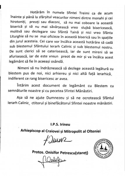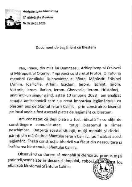 „Noi, Irineu, din mila lui Dumnezeu, Arhiepiscop al Craiovei și Mitropolit al Olteniei, împreună cu starețul Protos. Onisifor și membrii Consiliului Duhovnicesc al Sfintei Mănăstiri Frăsinei (Arhim. Ioanichie, Arhim. Ioachim, Ierom. Iachint, Ierom. Victorin, Ierom. Ilarion, Ierom. Ghervasie, Ierom. Hristofor), uniți într-un singur gând, astăzi, 10 ianuarie 2023, am analizat situația anticanonică creată împotriva legământului cu blestem pus de Sfântul lerarh Calinic, prin construirea bisericii pe locul unde a fost așezată piatra de legământ cu blestem.