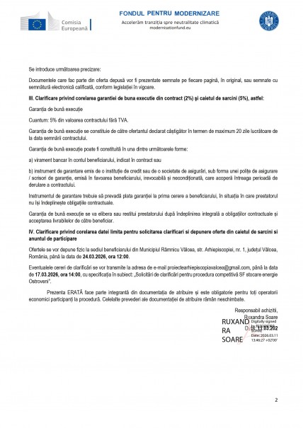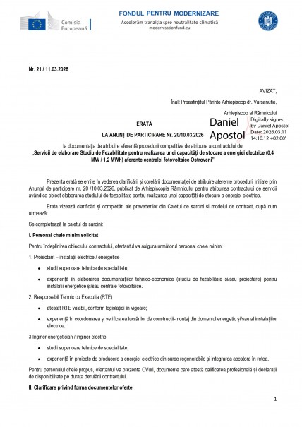 Prezenta erată se emite în vederea clarificării și corelării documentației de atribuire aferente procedurii inițiate prin Anunțul de participare nr. 20 /10.03.2026, publicat de Arhiepiscopia Râmnicului pentru atribuirea contractului de servicii având ca obiect elaborarea studiului de fezabilitate pentru realizarea unei capacități de stocare a energiei electrice. Erata vizează clarificări și completări ale prevederilor din Caietul de sarcini și modelul de contract, după cum urmează: Se completeazā la caietul de sarcini: I. Personal cheie minim solicitat Pentru îndeplinirea obiectului contractului, ofertantul va asigura următorul personal cheie minim: 1. Proiectant – instalații electrice / energetice • studii superioare tehnice de specialitate; • experiență în elaborarea documentațiilor tehnico-economice (studiu de fezabilitate și/sau proiectare) pentru instalații energetice și/sau centrale fotovoltaice. 2. Responsabil Tehnic cu Execuția (RTE) • atestat RTE valabil, conform legislației în vigoare; • experiență în coordonarea și verificarea lucrărilor de construcții-montaj din domeniul energetic și/sau al instalațiilor electrice. 3 Inginer energetician / inginer electric • studii superioare tehnice de specialitate; • experiență în proiecte de producere a energiei electrice din surse regenerabile și integrarea acestora în rețea. Pentru personalul cheie propus, ofertantul va prezenta CVuri, documente care atestă calificarea profesională și declarații de disponibilitate pe durata derulării contractului. II. Clarificare privind forma documentelor ofertei Se introduce următoarea precizare: Documentele care fac parte din oferta depusă vor fi prezentate semnate pe fiecare pagină, în original, sau semnate cu semnătură electronică calificată, conform legislației în vigoare. III. Clarificare privind corelarea garantiei de buna executie din contract (2%) şi caietul de sarcini (5%), astfel: Garanția de bună execuție Cuantum: 5% din valoarea contractului fără TVA. Garanția de bună execuție se constituie de către ofertantul declarat câștigător în termen de maximum 20 zile lucrătoare de la data semnării contractului. Garanția de bună execuție poate fi constituită în una dintre următoarele forme: a) virament bancar în contul beneficiarului, indicat în contract sau b) instrument de garantare emis de o instituție de credit sau de o societate de asigurări, sub forma unei polițe de asigurare / scrisori de garanție, emisă în favoarea beneficiarului, irevocabilă și necondiționată, care acoperă întreaga perioadă de derulare a contractului. Instrumentul de garantare trebuie să prevadă plata garanției la prima cerere a beneficiarului, în situația în care prestatorul nu își îndeplinește obligațiile contractuale. Garanția de bună execuție se va elibera sau restitui prestatorului după îndeplinirea integrală a obligațiilor contractuale și acceptarea livrabilelor de către beneficiar. IV. Clarificare privind corelarea datei limita pentru solicitarea clarificari si depunere oferte din caietul de sarcini si anuntul de participare Ofertele se vor depune fizic la sediul beneficiarului din Municipiul Râmnicu Vâlcea, str. Arhiepiscopiei, nr. 1, județul Vâlcea, România, până la data de 24.03.2026, ora 12:00. Eventualele cereri de clarificări se vor transmite la adresa de e-mail proiectearhiepiscopiavalcea@gmail.com, până la data de 17.03.2026, ora 14:00, cu specificația în subiect: „Solicitări de clarificări pentru procedura competitivă SF stocare energie Ostroveni”. Prezenta ERATĂ face parte integrantă din documentația de atribuire și este obligatorie pentru toți operatorii economici participanți la procedură. Celelalte prevederi ale documentației de atribuire rămân neschimbate.