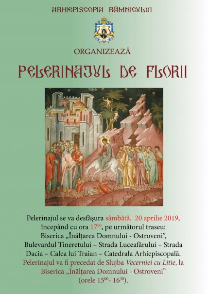 Astfel, clericii și credincioșii de la parohiile Protopopiatului Râmnicu-Vâlcea și Protopopiatului Călimănești vor participa sâmbătă, 20 aprilie, în ajunul praznicului Intrării Domnului în Ierusalim, la pelerinajul care va avea loc în municipiul Râmnicu-Vâlcea. Procesiunea va începe de la Biserica Înălțarea Domnului – Ostroveni (ora 17:00), după săvârșirea slujbei Vecerniei (ora 15:00) și a binecuvântării ramurilor de salcie de către Înaltpreasfințitul Părinte Varsanufie, Arhiepiscopul Râmnicului, care vor fi împărțite pelerinilor. De la această biserică, procesiunea se va desfășura pe următorul traseu: bd. Tineretului – str. Luceafărului –str. Dacia (cu oprire la Biserica Sfântul Ioan Botezătorul) – bd. Calea lui Traian (cu oprire la Biserica Sfânta Cuvioasă Parascheva și Biserica Toți Sfinții) – Aleea Castanilor – str. Carol I – Catedrala Arhiepiscopală Sfântul Ierarh Nicolae din Râmnicu-Vâlcea.