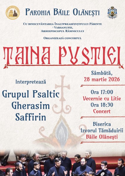 Grupul psaltic „Gherasim Safirin” va susține la Biserica „Izvorul Tămăduirii” din Băile Olănești, în data de 28 martie 2026, începând cu ora 18:30, un concert de muzică psaltică închinat perioadei liturgice a Postului Mare.