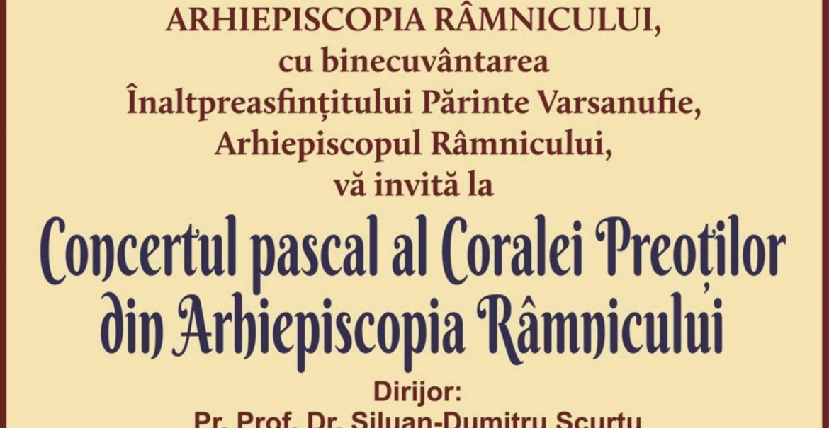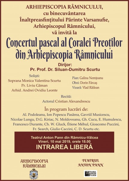 Vineri, 10 mai, începând cu orele 18.00, cu binecuvântarea Înaltpreasfințitului Părinte Arhiepiscop Varsanufie, Corala Preoților din Arhiepiscopia Râmnicului va susține Concertul Pascal la Teatrul Anton Pann din Râmnicu-Vâlcea.
