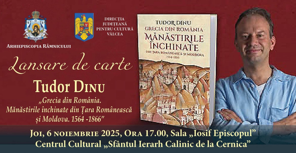 Un volum-eveniment, cu sute de ilustrații – monumente, fresce și obiecte. Noua carte a lui Tudor Dinu, „Grecia din România. Mănăstirile închinate din Ţara Românească şi Moldova, 1564–1866”, va fi lansat joi, 6 noiembrie 2025, începând cu ora 17.00, a Sala „Iosif Episcopul” din cadrul Centrului Cultural „Sfântul Ierarh Calinic de la Cernica”.