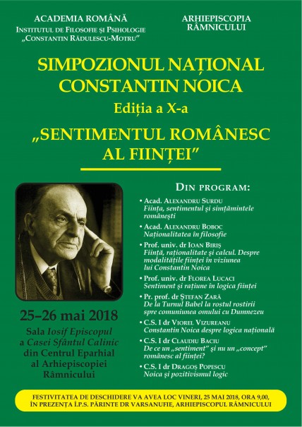 Institutul de Filosofie și Psihologie „Constantin Rădulescu-Motru” al Academiei Române și Arhiepiscopia Râmnicului organizează la Râmnicu-Vâlcea în perioada 25-26 mai 2018, ediția a zecea a Simpozionului Național Constantin Noica, cu tema „Sentimentul românesc al ființei”.