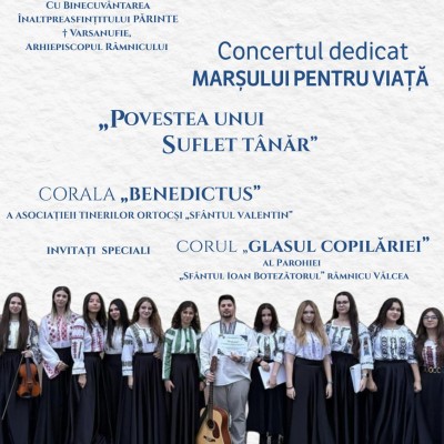 Corala de Tineri „Benedictus” a Asociației Tinerilor Ortodocși „Sfântul Valentin” – Vâlcea organizează sâmbătă, 28 martie, de la ora 16:00, la Arhiepiscopia Râmnicului,sala „Iosif Episcopul” , concertul intitulat „Povestea unui suflet tânăr”.