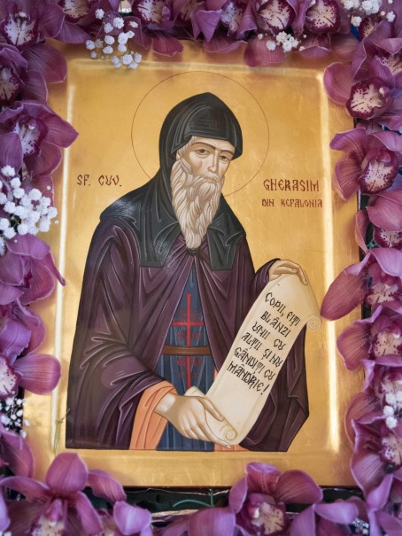 În urma finalizării lucrărilor de pictură în frescă la biserica cu hramul Sfinţii Trei Ierarhi şi la paraclisul Sfântul Cuvios Gherasim cel Nou din Kefalonia, obştea Mănăstirii Gruiu Lupului, păstorită de protos. Macarie Roman, s-a pregătit pentru pecetluirea în har a lucrărilor săvârşite. Astfel, în ziua de prăznuire a Sfântului Cuvios Gherasim cel Nou din Kefalonia, Înaltpreasfințitul Părinte Irineu, Arhiepiscop al Craiovei și Mitropolit al Olteniei, împreună cu Înaltpreasfințitul Părinte Varsanufie, Arhiepiscopul Râmnicului, înconjurați de un numeros sobor de preoți și diaconi, au săvârşit slujba de sfinţire a picturii şi slujba de târnosire a paraclisului. Cele două sfinte slujbe au fost urmate de săvârşirea Dumnezeiştii Liturghii.