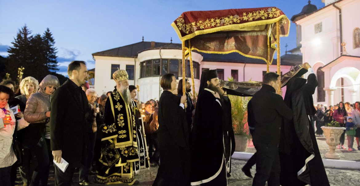 La sfârşitul Doxologiei, a avut loc tradiţionala procesiune în jurul Catedralei Arhiepiscopale, care simbolizează ducerea către mormânt a Mântuitorului. Au avut loc patru opriri, în cele patru laterale ale catedralei, iar la fiecare oprire a fost rostită câte o ectenie. După procesiune, toţi credincioşii prezenţi au trecut pe sub Sfântul Epitaf, sărutând Sfânta Evanghelie și Sfânta Cruce, ținute spre închinare de Chiriarhul Râmnicului. Sfântul Epitaf a fost aşezat pe Sfânta Masă, cântându-se troparul Iosif cel cu bun chip…